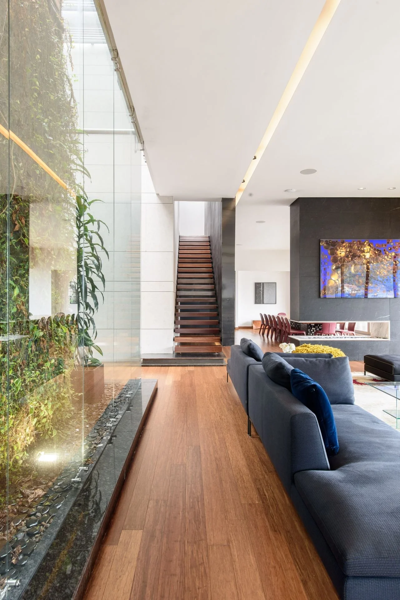 El acceso al penthouse es a través de ascensores privados, que conducen a un elegante foyer, abriendo paso a un salón principal y comedor que comparten una chimenea a gas, creando un ambiente cálido y versátil. La cocina integral, equipada con mobiliario y equipos de alta gama, es perfecta para escenas modernas y funcionales.