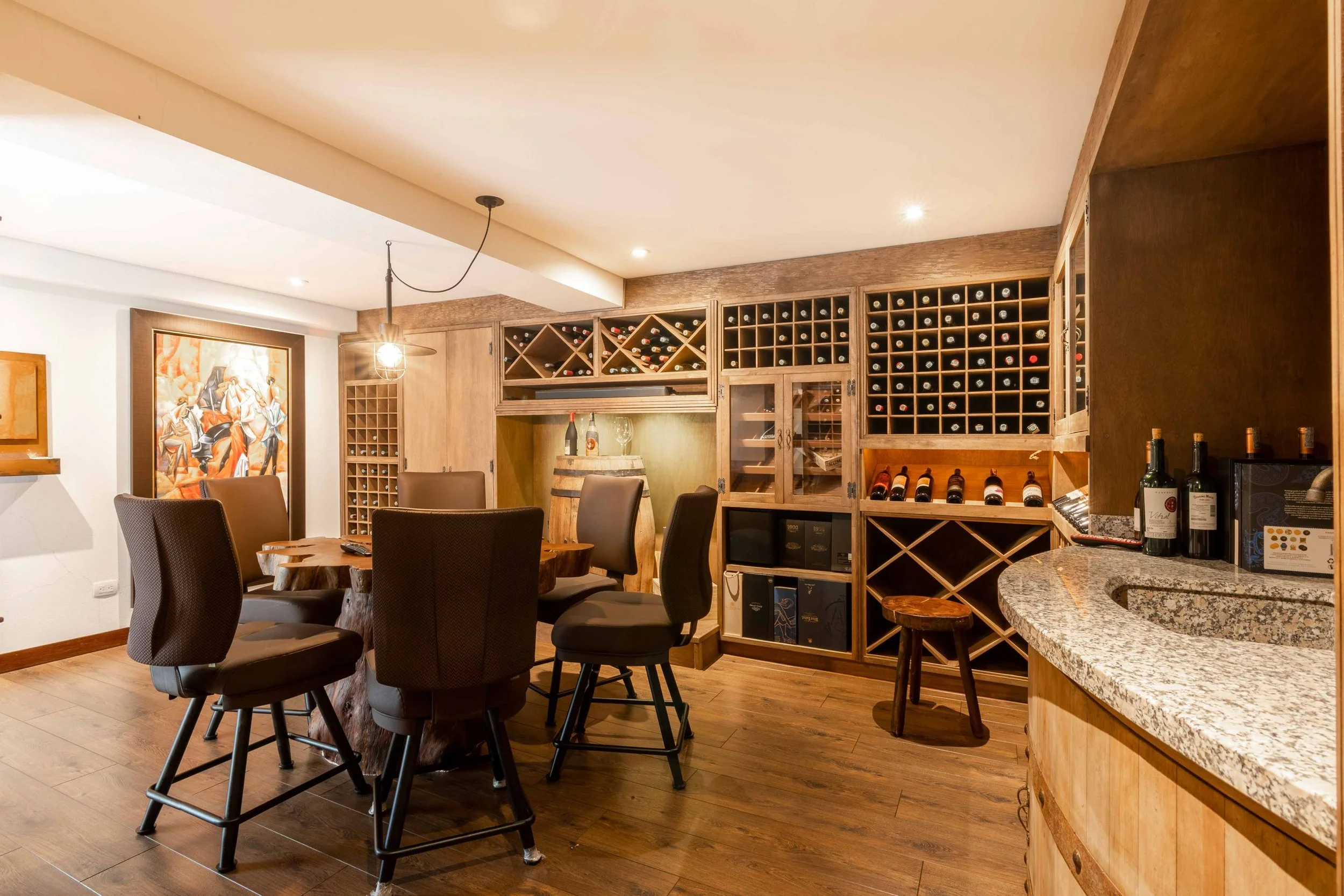 Uno de los espacios más especiales de la casa se encuentra en el basement, que cuenta con una oficina/estudio con baño privado, una cava con capacidad para 730 botellas, pantalla de proyección y una zona de juegos de mesa, lo que brinda escenarios únicos para escenas íntimas, nocturnas o de entretenimiento.
