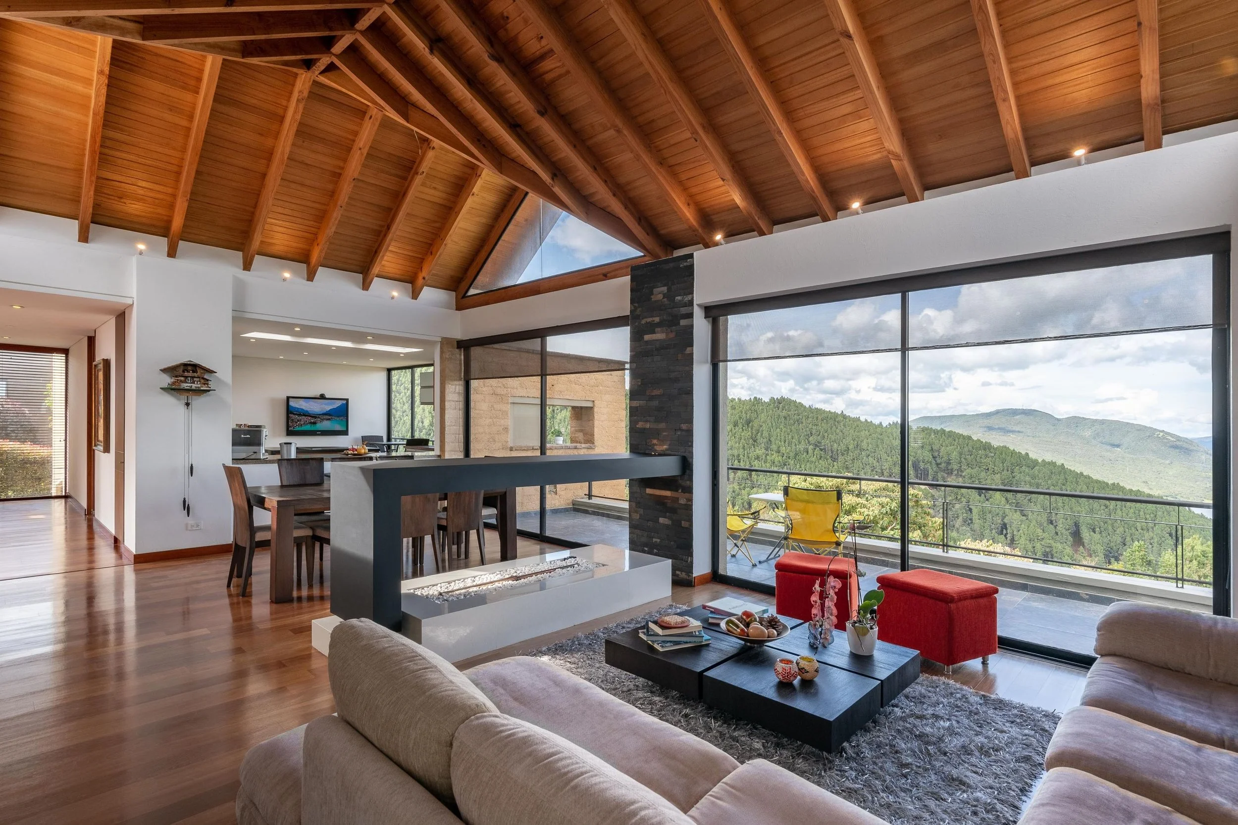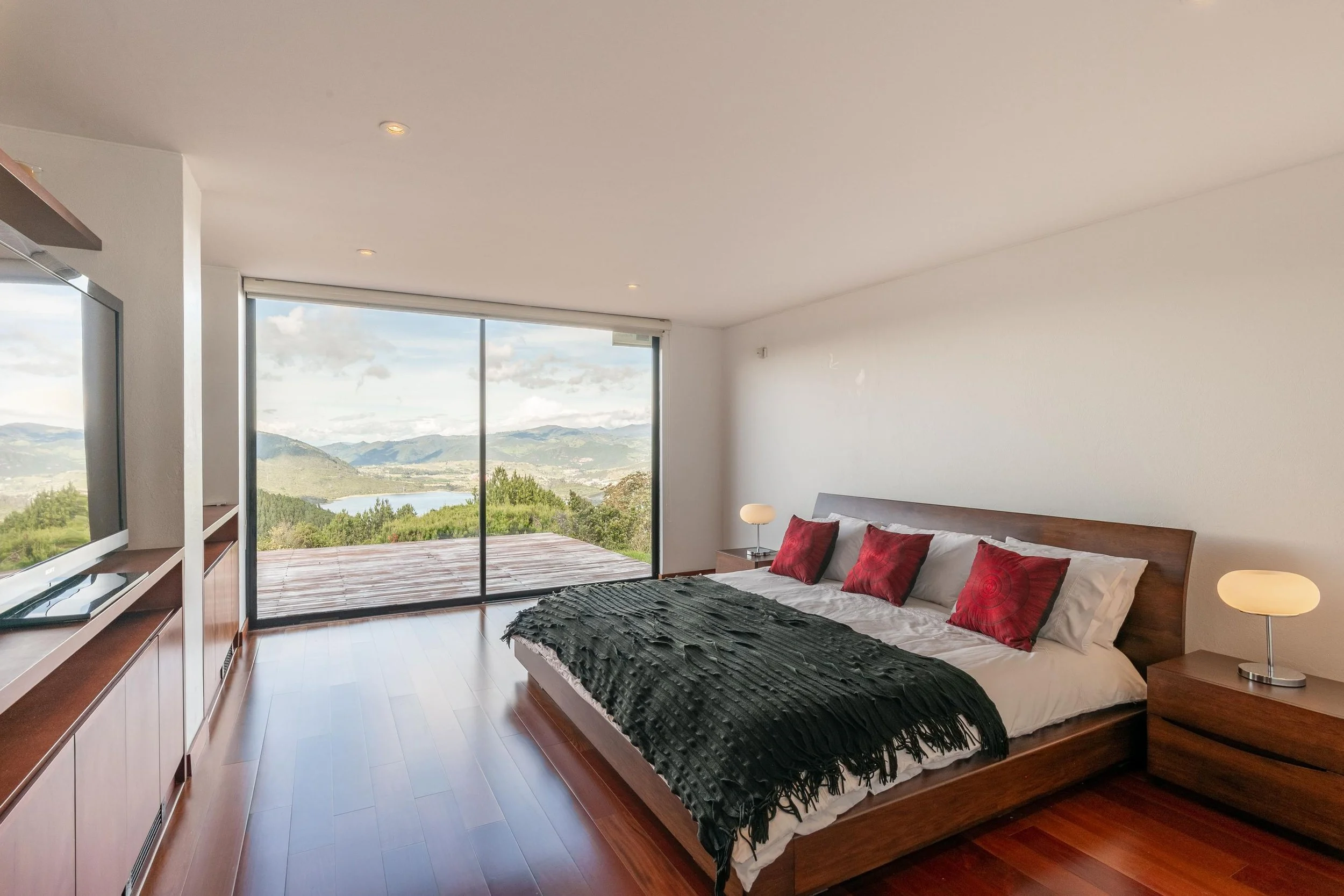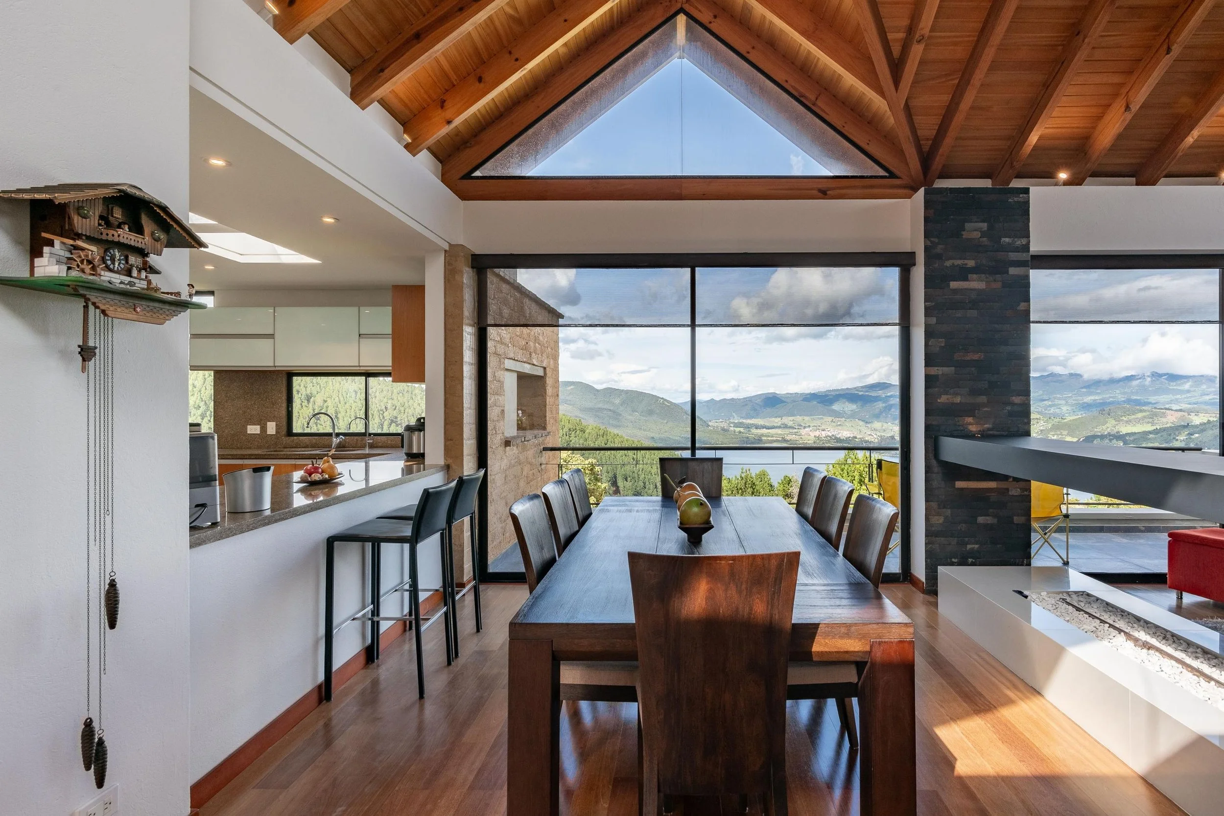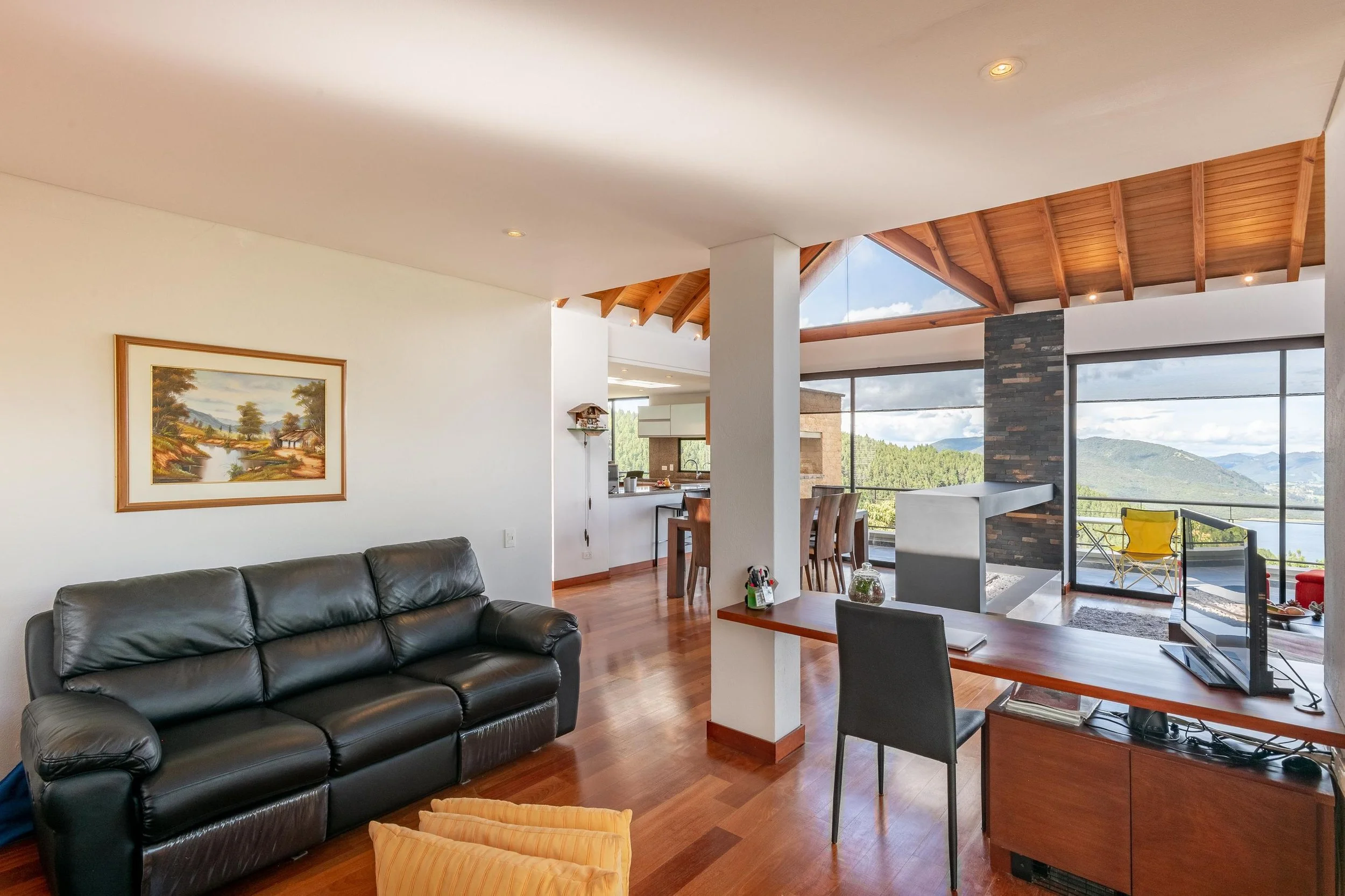 La casa ofrece una vista panorámica a la laguna desde cualquier área, brindando una sensación de amplitud y conexión con el paisaje. Su diseño abierto y cocina estilo americano permiten una integración fluida entre la sala y el comedor, creando espacios versátiles para distintas ambientaciones. Además, los detalles en madera en todo el pisoaportan un toque de lujo, calidez y sofisticación, ideal para producciones que requieren un ambiente acogedor y elegante.