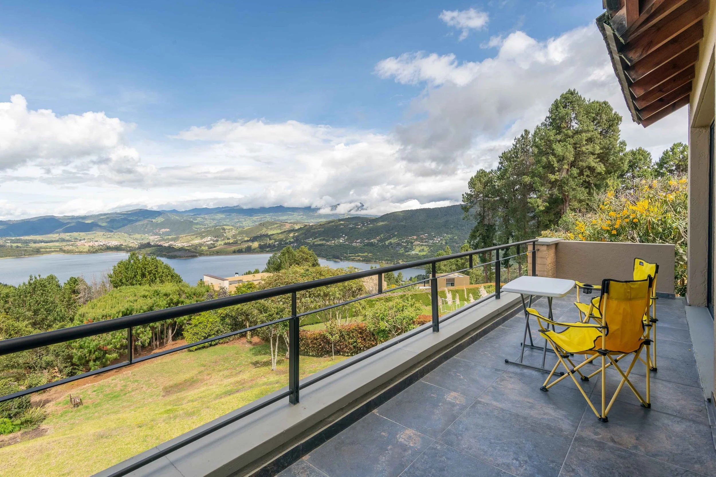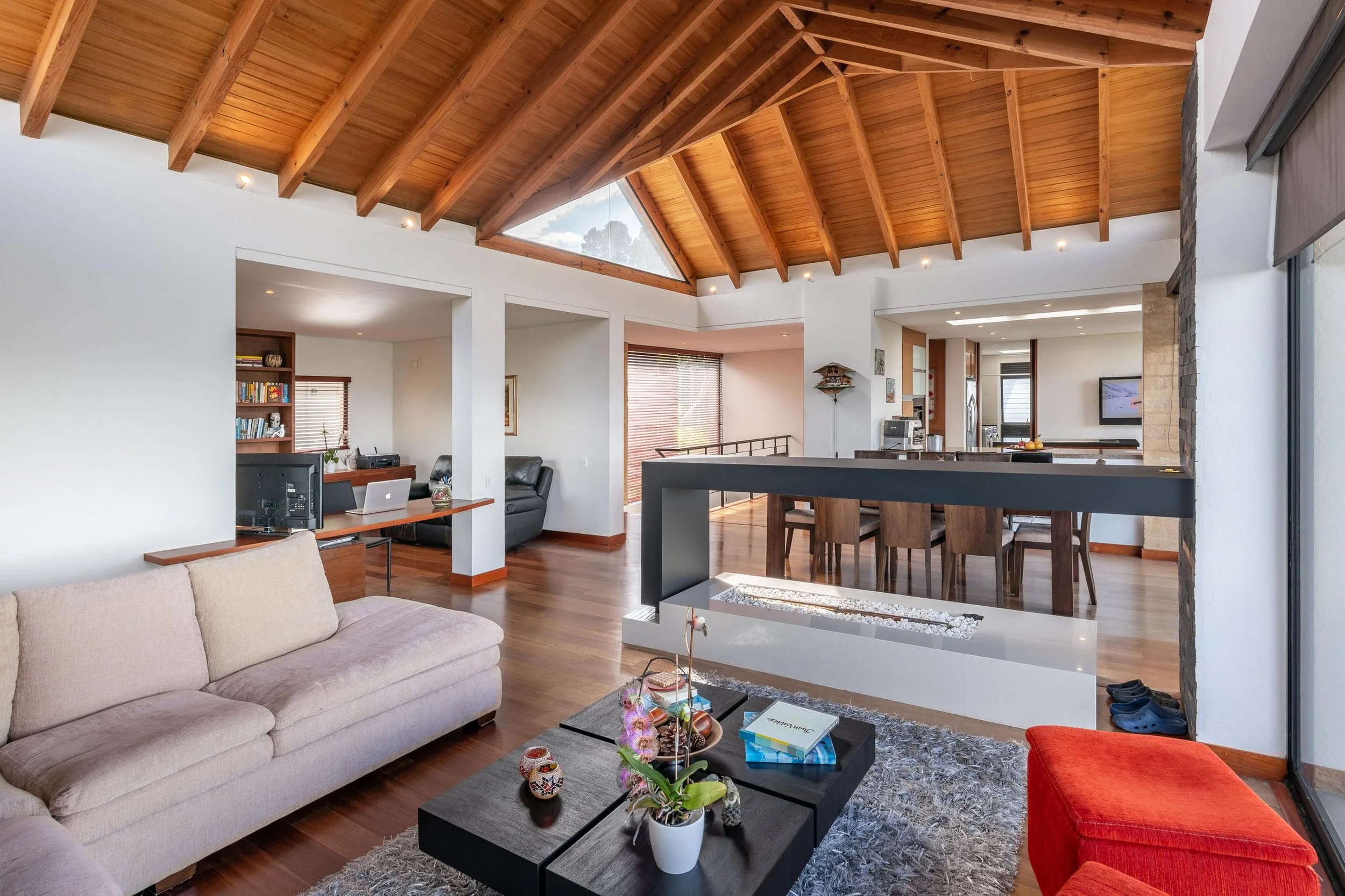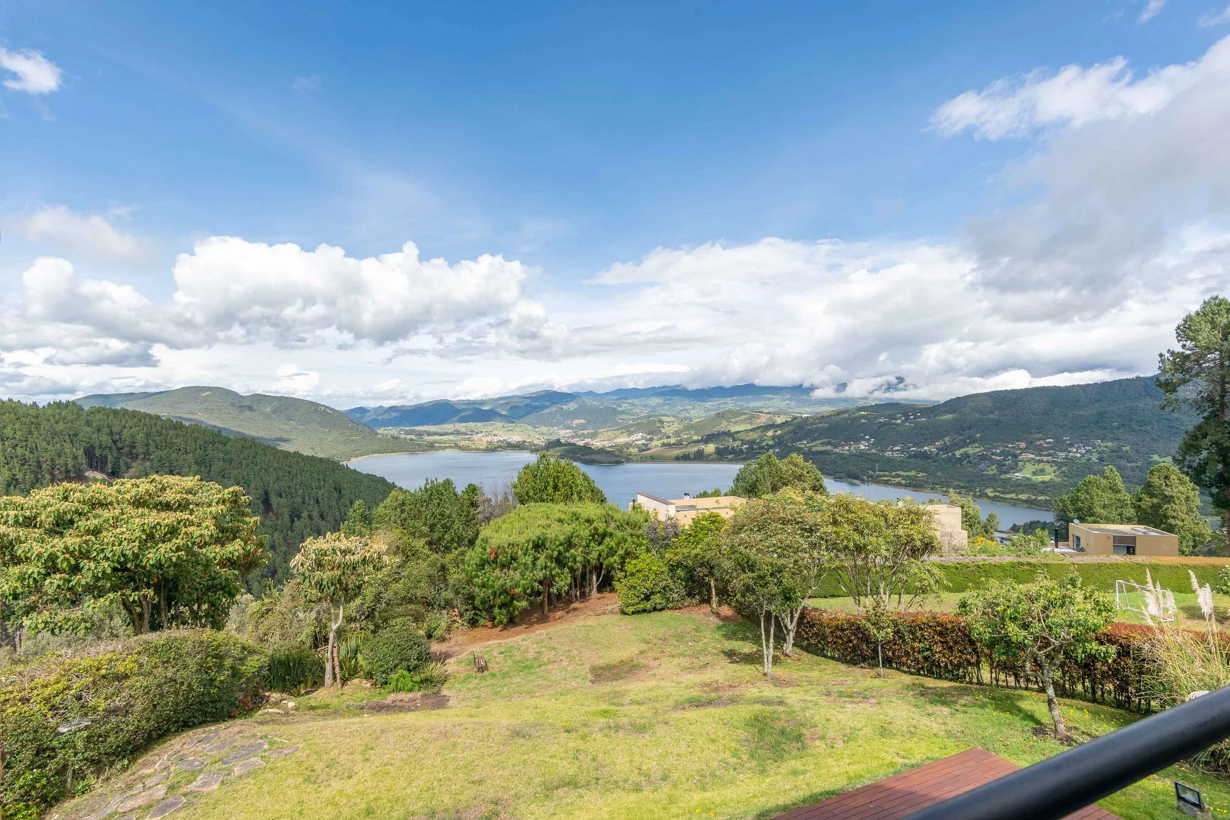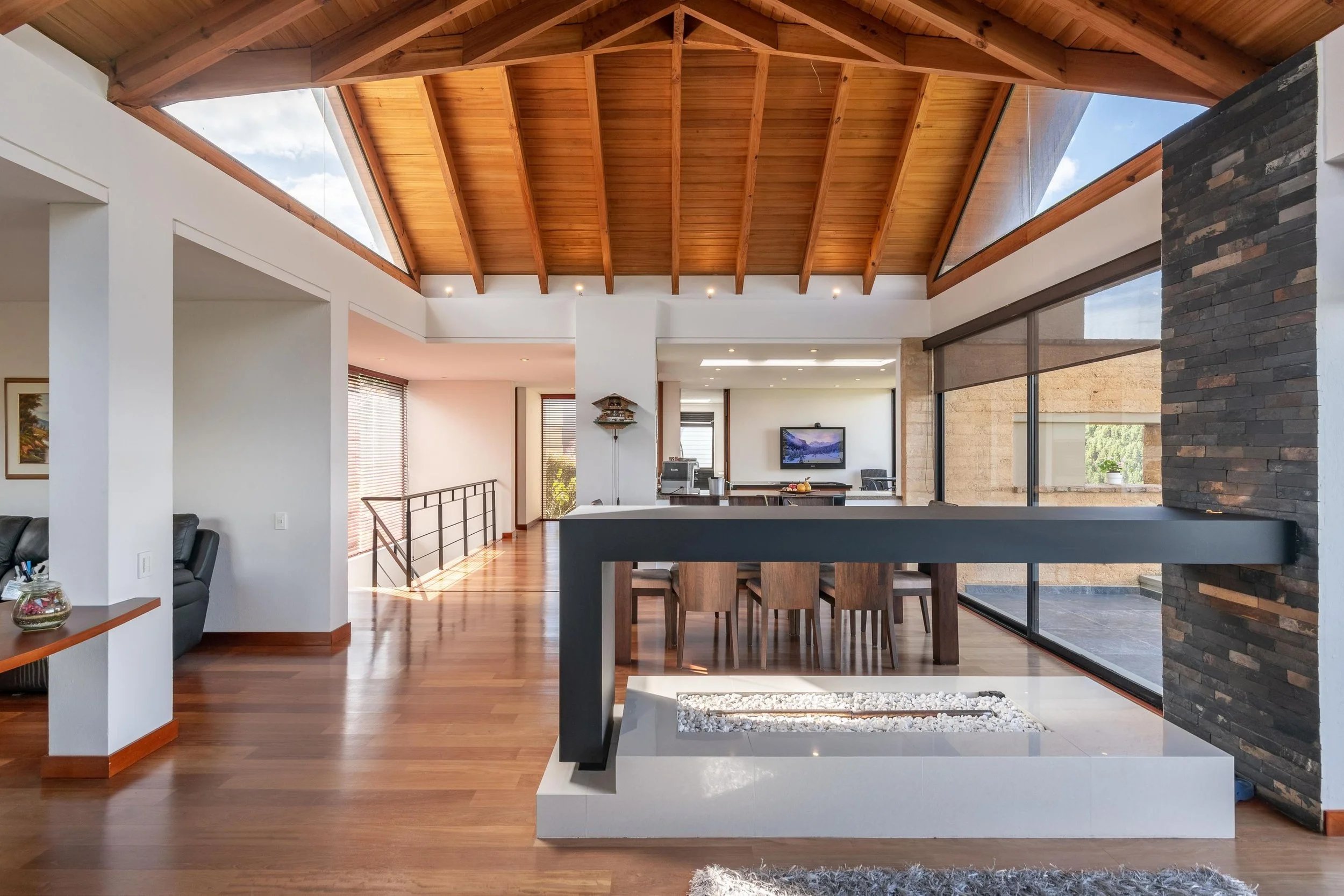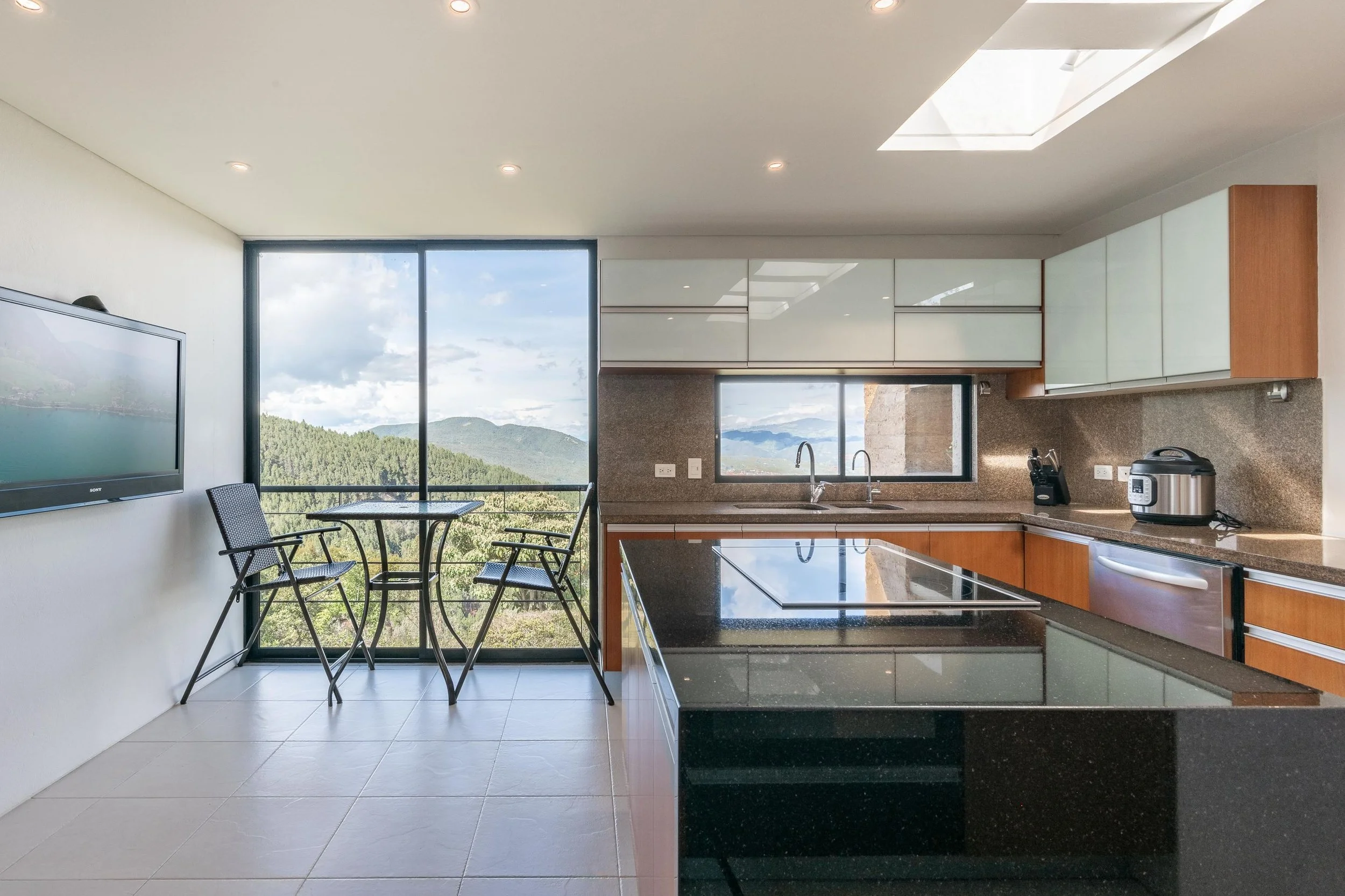 La casa ofrece una vista panorámica a la laguna desde cualquier área, brindando una sensación de amplitud y conexión con el paisaje. Su diseño abierto y cocina estilo americano permiten una integración fluida entre la sala y el comedor, creando espacios versátiles para distintas ambientaciones. Además, los detalles en madera en todo el pisoaportan un toque de lujo, calidez y sofisticación, ideal para producciones que requieren un ambiente acogedor y elegante.