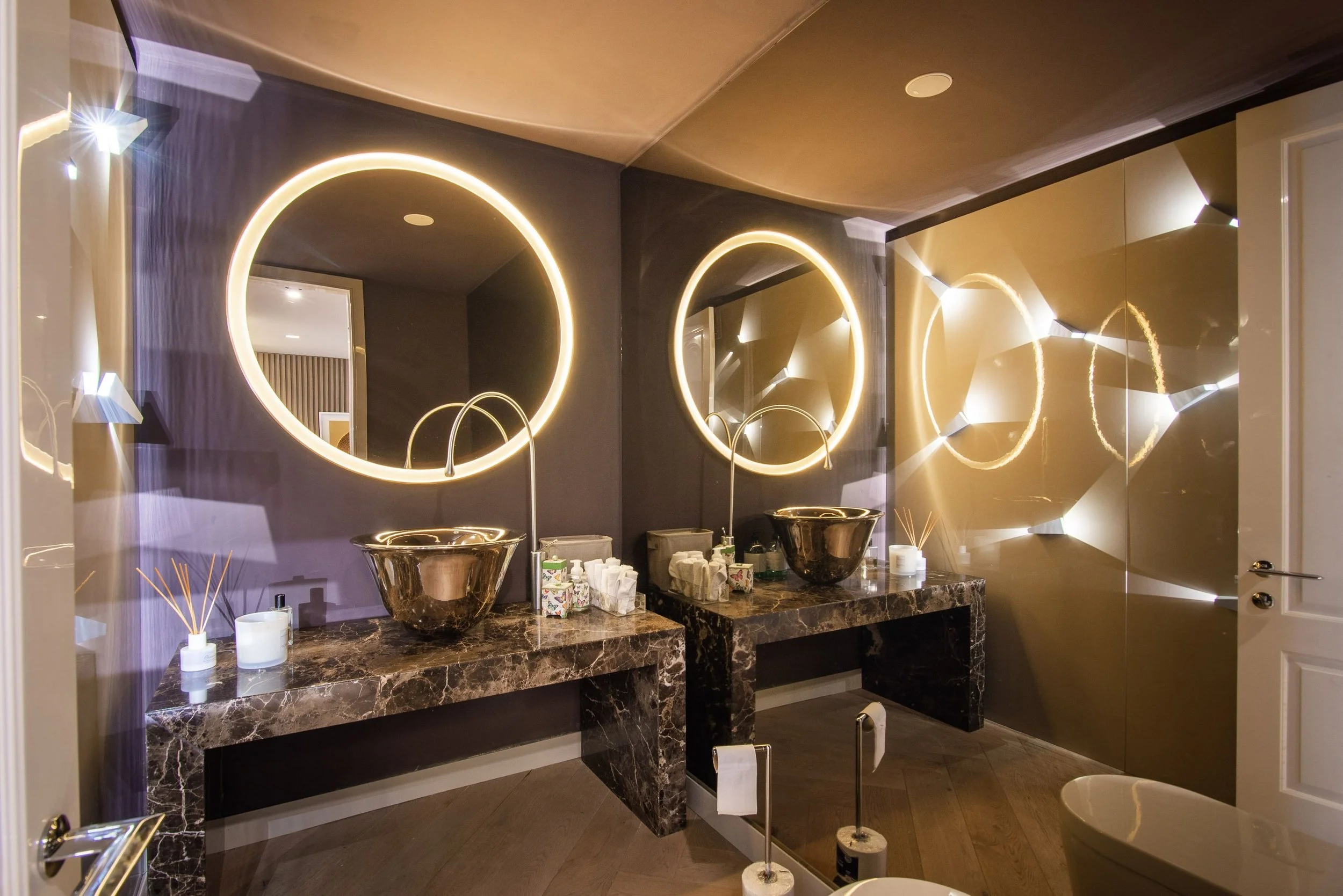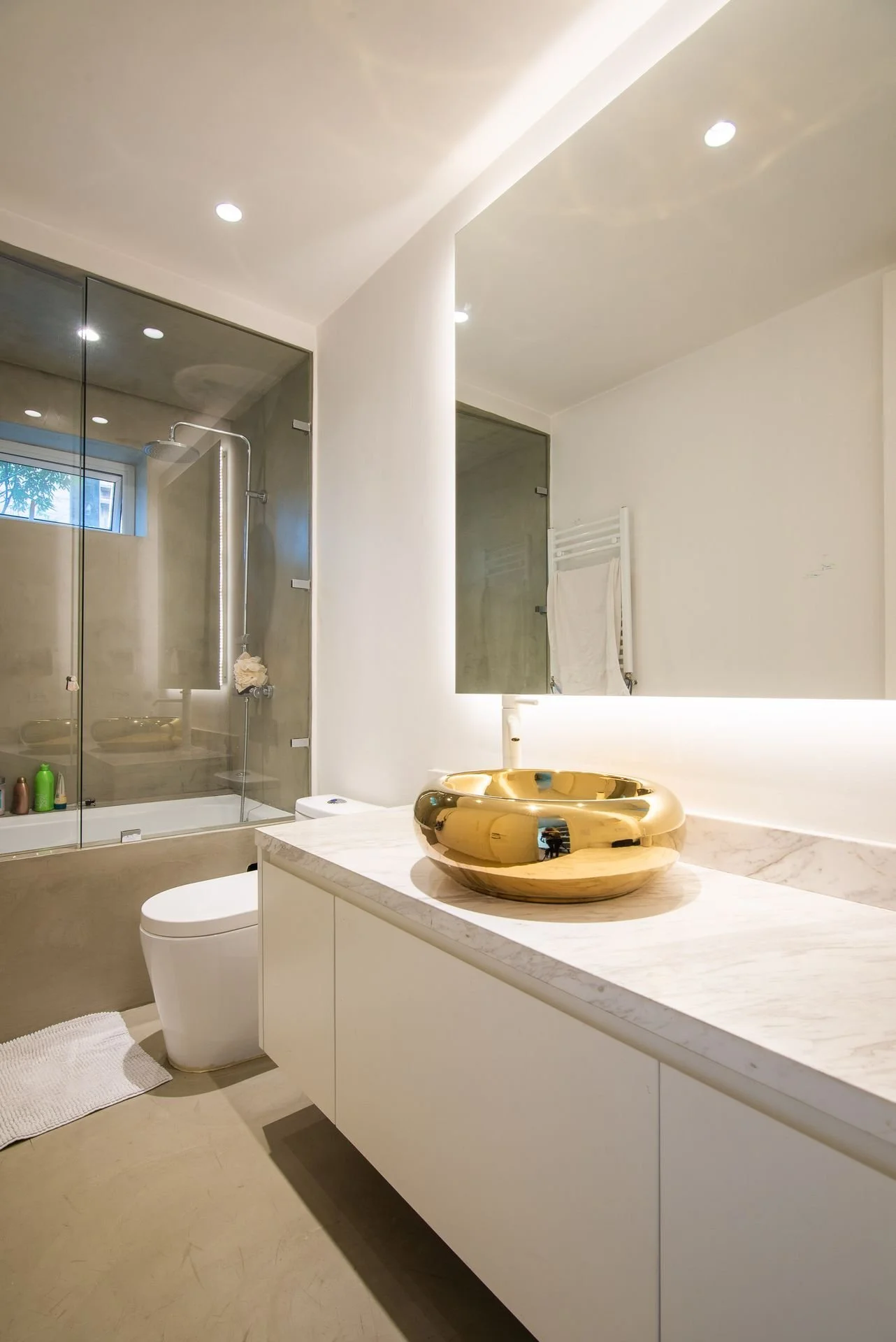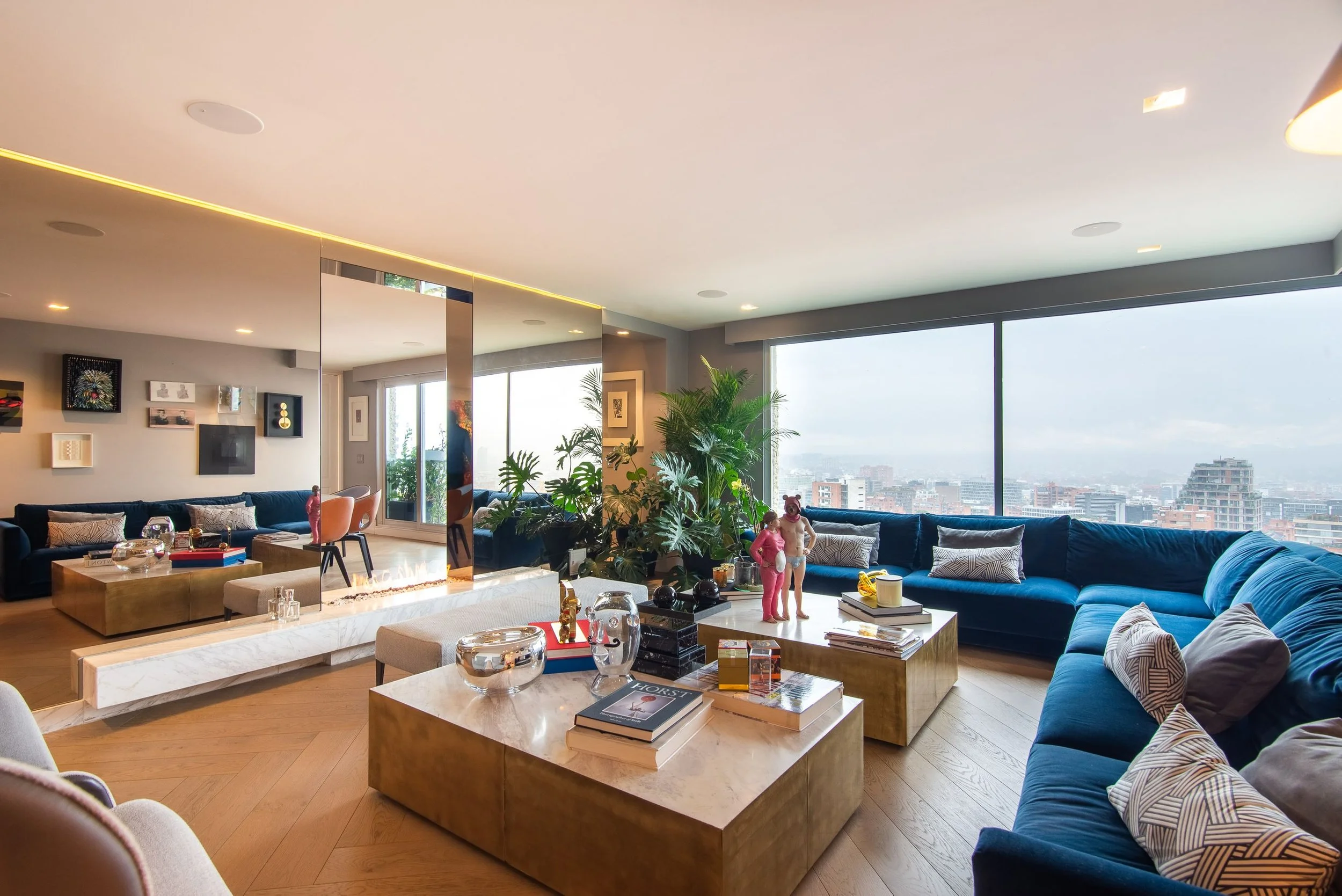La zona social cuenta con sala y comedor independientes, separados por una pared de espejos que amplían visualmente el espacio. La cocina, con una elegante isla y un ventanal que ofrece vistas citadinas, es perfecta para capturar escenas vibrantes.