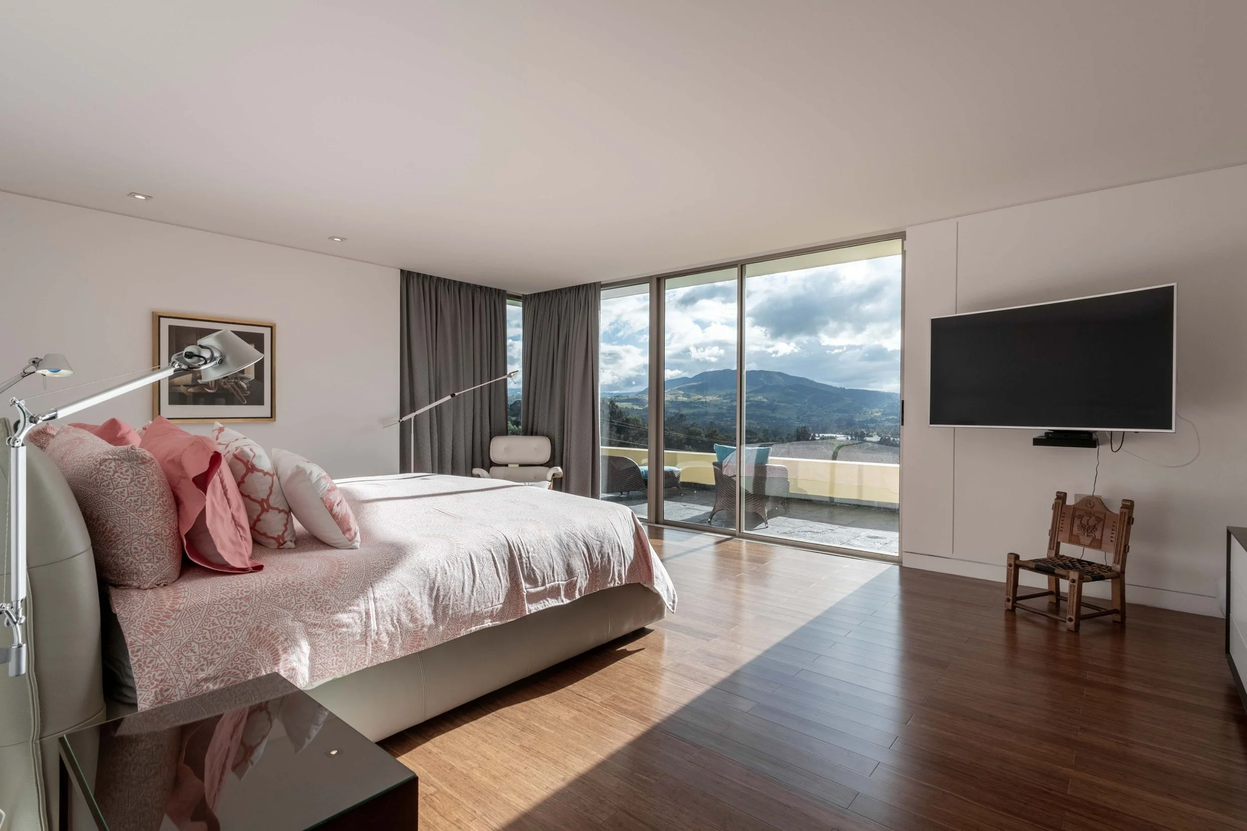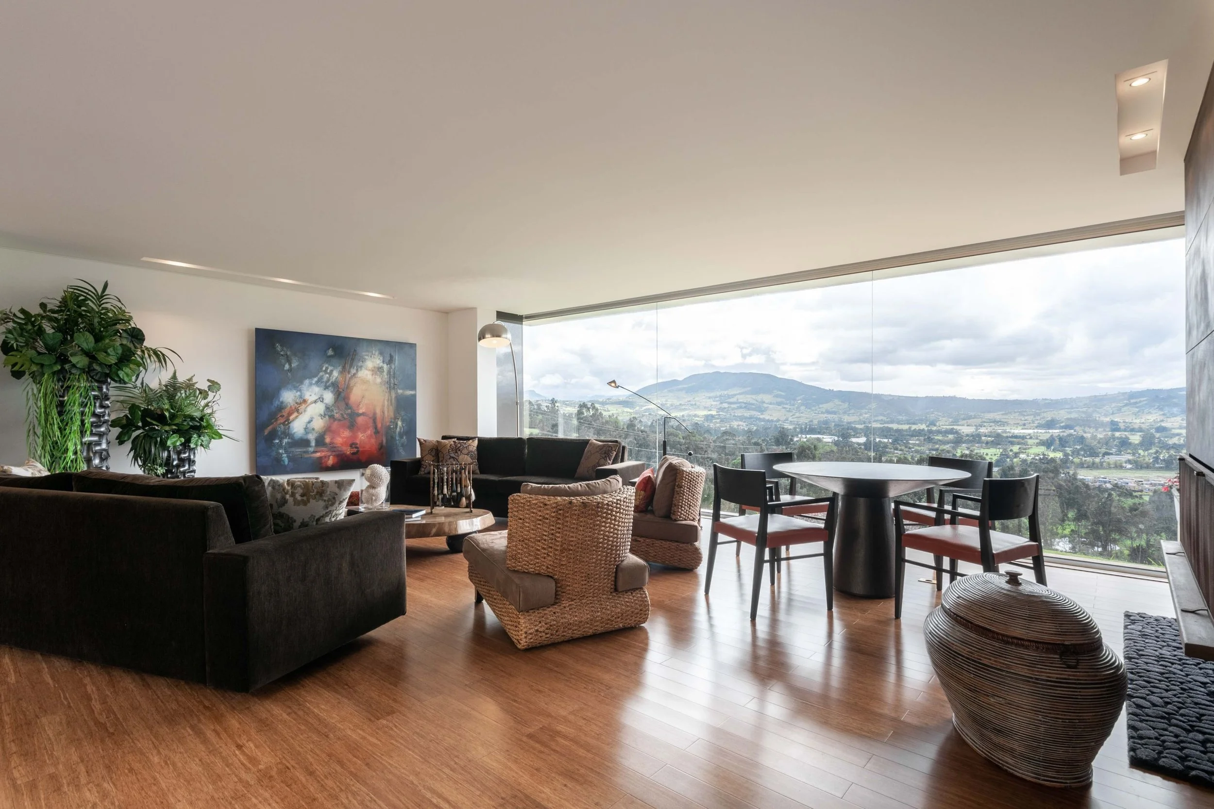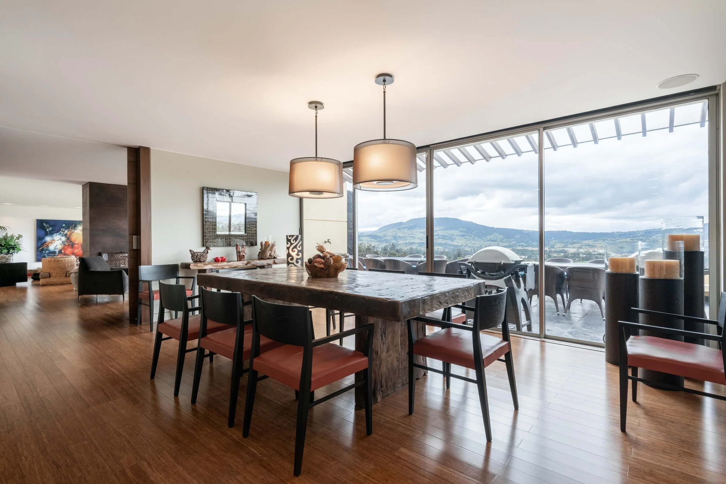 Distribuida en dos niveles, la propiedad destaca por su amplio y luminoso comedor con una vista imponente al valle de Sopó, creando un telón de fondo natural espectacular. La cocina abierta con diseño de isla aporta un aire moderno y sofisticado, mientras que la gran terraza con BBQ que rodea toda la casa añade versatilidad para diversas ambientaciones.